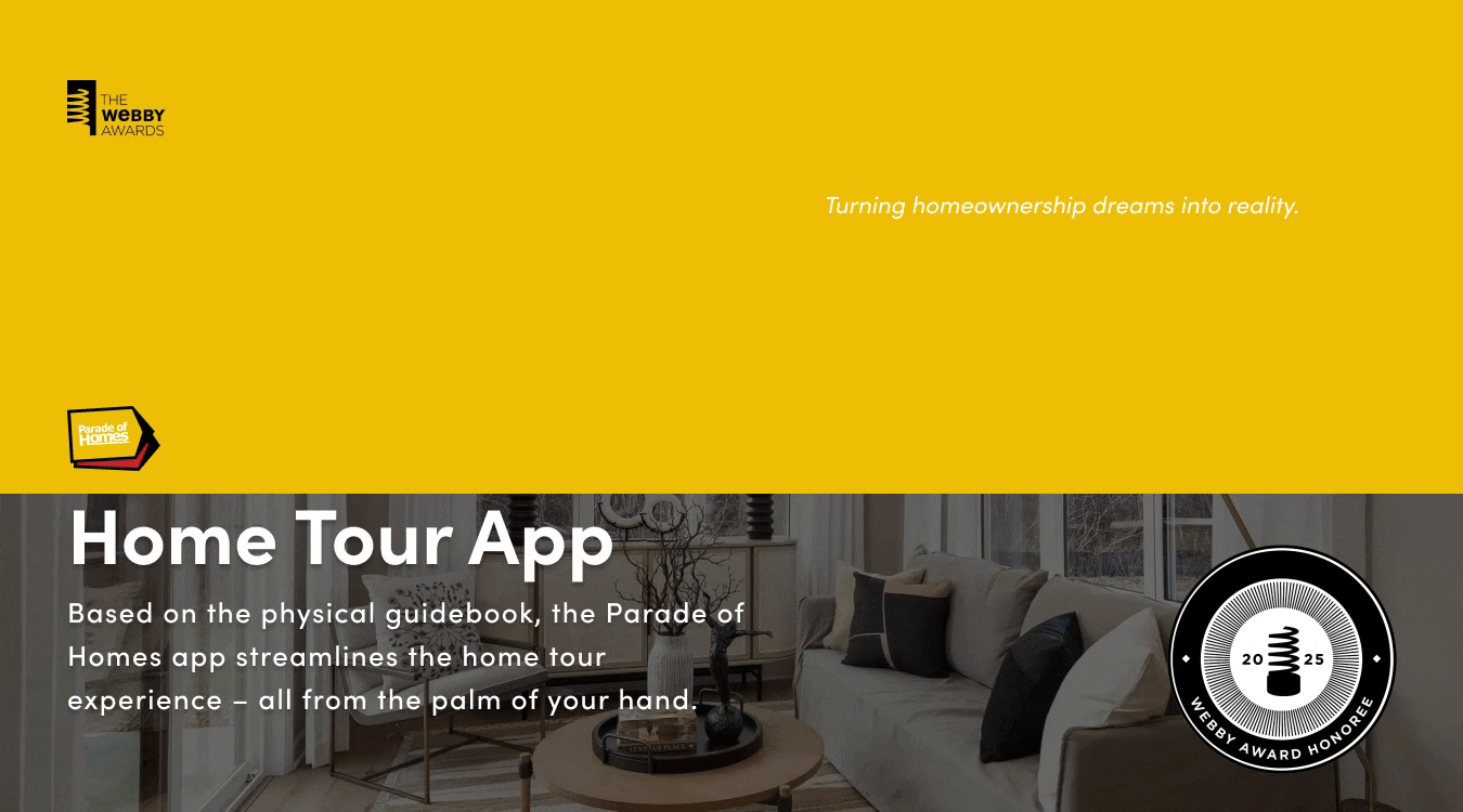 House First Minnesota’s Parade of Homes mobile app was named a Webby Award Honoree in the Best Visual Design category. Honoree status, as awarded by the International Academy of Digital Arts & Sciences, recognizes only the top 25% of entries in the Webby Awards.